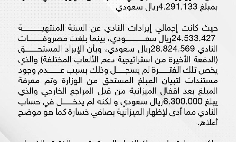 وأشار البيان إلى أن إيرادات النادي عن السنة المنتهية 24.533.427 بينما بلغت مصروفات النادي 28.824.569 موضحا أن الإيراد المستحق ( الدفعة الأخيرة من استراتيجية دعم الألعاب المختلفة ) والذي يخص فترة تثبيت التقرير لم يسجل بسبب عدم وجود مستندات لتبيان المبلغ المستحق من الوزارة وتم معرفة المبلغ بعد إقفال الميزانية من قبل المراجع الخارجي والذي يبلغ 6.300.000 ولكنه لم يدخل حساب النادي مما أدى لإظهار الميزانية بصافي خسارة .