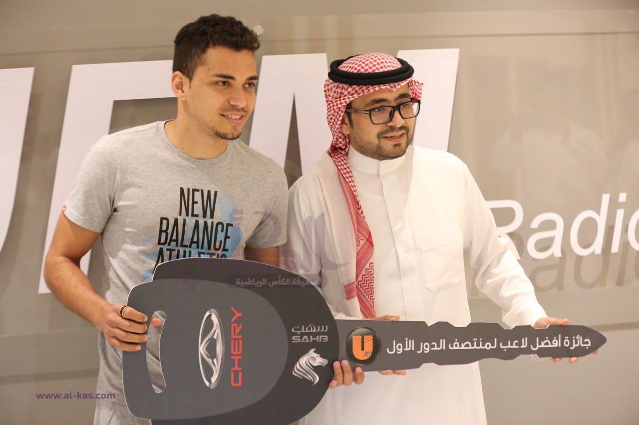 وسلم الجائزة للاعب، مدير البرامج الرياضية في (يو اف ام) الأستاذ تركي السالم، ومدير المبيعات في شيري السعودية أحمد شكري، بالإضافة إلى الوفد الصيني الخاص بسيارات شيري في الشرق الأوسط.