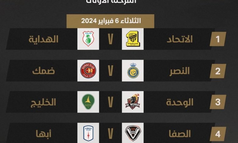 وتنطلق يوم الثلاثاء 6 فيراير وستقام خلالها أربعة لقاءات بنظام خروج المهزوم من مباراة واحدة حيث سيلعب في المباراة رقم 1 الاتحاد مع الهداية وكذلك مباراة رقم 2 النصر مع ضمك بجانب مباراة رقم 3 الوحدة مع الخليج واخيرا مباراة رقم 4 الصفا مع أبها .