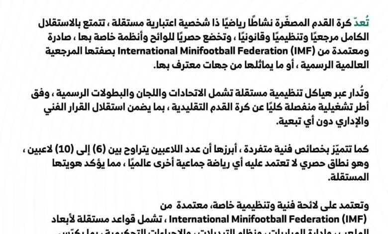 وأشار البيان إلى أن كرة القدم المصغّرة تعتمد على لائحة فنية وتنظيمية خاصة، صادرة ومعتمدة من الاتحاد الدولي لكرة القدم المصغّرة (IMF) أو ما يماثلها، تشمل قواعد مستقلة لأبعاد الملاعب، وآليات إدارة المباريات، ونظام التبديلات، والإجراءات التحكيمية، بما يرسّخ استقلالها القانوني والفني كنشاط رياضي قائم بذاته.