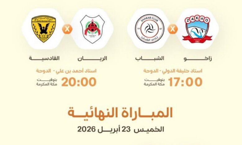 وتُقام مباراتا الدور نصف النهائي يوم 19 أبريل 2026، إذ يحتضن استاد خليفة الدولي المواجهة الأولى عند الساعة 17:00 بين زاخو والشباب، فيما يستضيف استاد أحمد بن علي المباراة الثانية عند الساعة 20:00 بين الريان والقادسية.