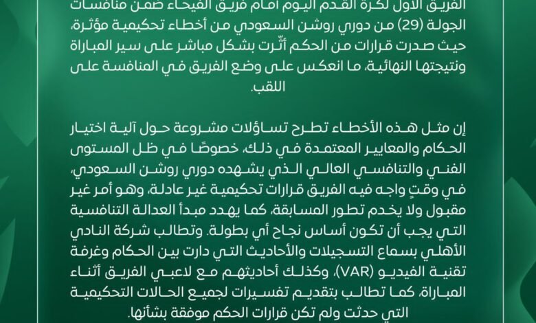وأكد البيان أن الحفاظ على العدالة التنافسية يمثل ركناً أساسياً في نجاح أي بطولة، مشدداً على ضرورة اتخاذ خطوات عملية تضمن نزاهة المنافسات، بما يعكس المكانة المتقدمة التي بلغها الدوري السعودي.