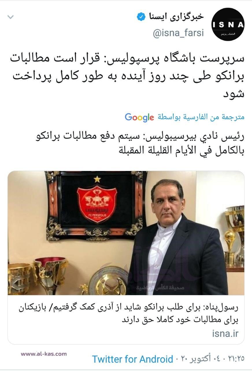 نشرت وكالة ( ISNA ) آيسنا الإيرانية تصريحاً منسوباً لرئيس نادي بيرسبوليس قوله ( سيتم دفع مطالبات مدرب الفريق برانكو بالكامل في الأيام القليلة المقبلة )