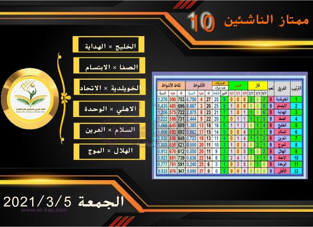 في الثالثة عصرا على صالة نادي الخويلدية الذي يدخل اللقاء وهو في صدارة الترتيب برصيد ٢٥ نقطة من ٩ انتصارات بدون أي خسارة . أما الاتحاد عاشراً برصيد ٨ نقاط من انتصارين .