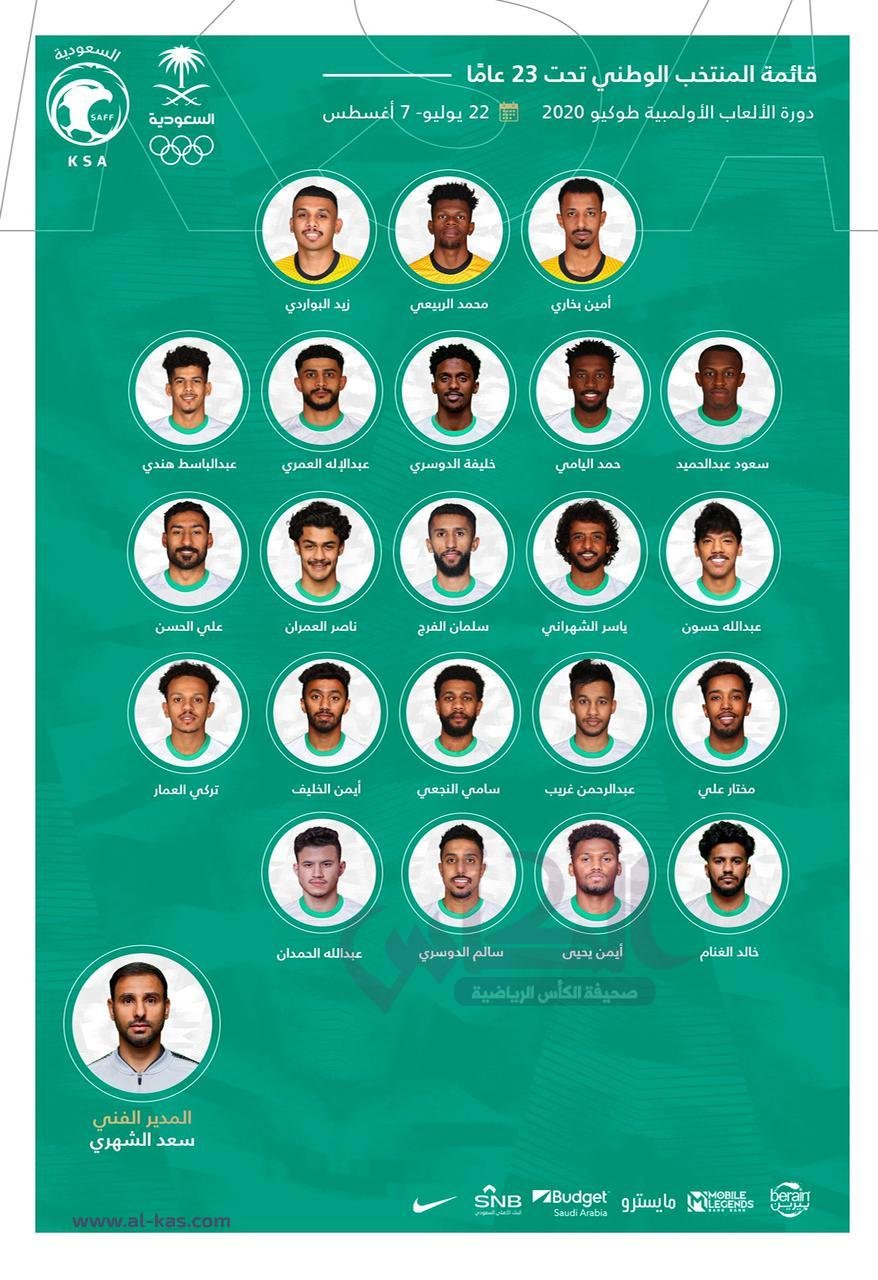 وتضم قائمة “الأخضر” التي تم استدعاؤها من قِبل المدير الفني سعد الشهري للمشاركة في دورة الألعاب الأولمبية (22) لاعبًا، أسماؤهم على النحو التالي: أمين بخاري، محمد الربيعي، زيد البواردي، حمد اليامي، خليفة الدوسري، عبدالإله العمري، سعود عبدالحميد، عبدالله حسون، عبدالباسط هندي، ياسر الشهراني، ناصر العمران، علي الحسن، سلمان الفرج، مختار علي، عبدالرحمن غريب، سامي النجعي، أيمن الخليف، تركي العمار، خالد الغنام، أيمن يحيى، سالم الدوسري، وعبدالله الحمدان.