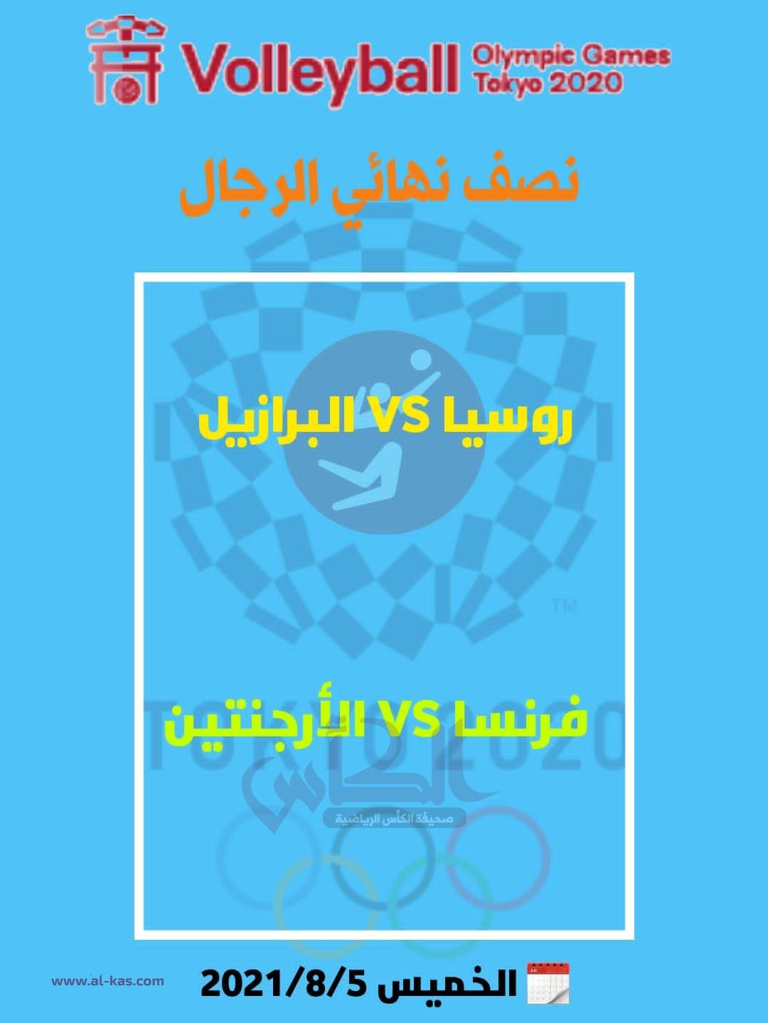 يترقب محبو ومتابعو كرة الطائرة العالمية، الخميس، لقائي نصف نهائي كرة الطائرة (الرجال) في دورة الألعاب الأولمبية طوكيو 2020 .