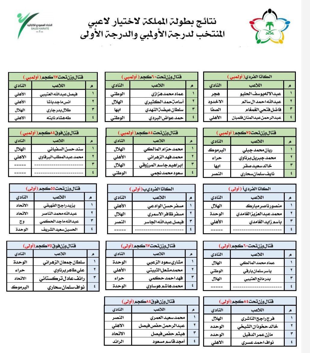 بمشاركة نخبة من لاعبي الأندية، اختتمت منافسات الكاتا والقتال في بطولة المملكة لاختيار لاعبي المنتخب، والتي أقيمت على صالة وزارة الرياضة بالملز بمدينة الرياض للدرجة الأولى والأولمبياد والتي نظمها الاتحاد السعودي للكاراتيه.
