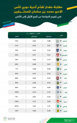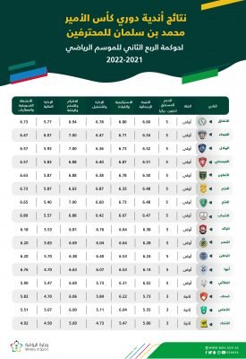 أعلن فريق إستراتيجية دعم الأندية الرياضية في وزارة الرياضة، نتائج الحوكمة للربع الثاني من الموسم الرياضي 2021-2022م، لأندية دوري كأس الأمير محمد بن سلمان للمحترفين، والتي تخولها الحصول على دعم إضافي، وفقًا لإستراتيجية دعم الأندية الرياضية.