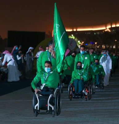 وحمل العلم السعودي في حفل الافتتاح اللاعب عبدالرحمن القرشي صاحب الميدالية البرونزية برياضة ألعاب القوى خلال دورة الألعاب البارالمبية طوكيو 2020.