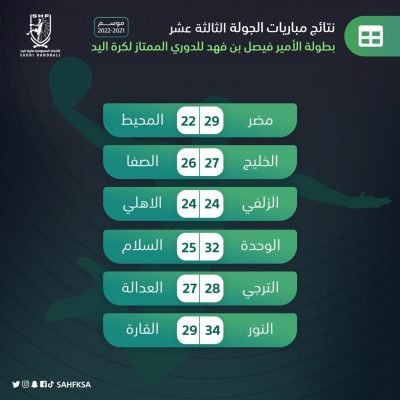 وتغلب فريق النور على نظيره القارة 34-29 ضمن لقاءات الجولة الثالثة عشر من الدوري السعودي الممتاز لكرة اليد وبذلك رفع النور رصيده إلى 20 نقطة في المركز الثالث وتجمد رصيد القارة عند 13 نقطة في المركز السادس، وفي لقاء آخر جمع فريقا الترجي والعدالة تمكن الترجي من الظفر بنقطتي اللقاء ورفع رصيده الى 13 نقطة سابعاً وبقى العدالة في مركزه الحادي عشر بنقطتين.