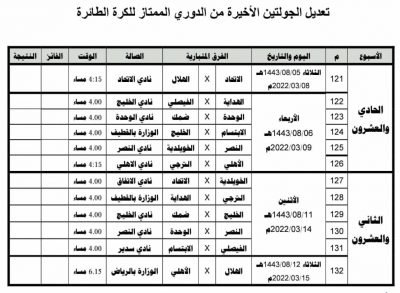 اعتمد الاتحاد السعودي للكرة الطائرة موعد إقامة الجولتين الأخيرتين من مسابقة الدوري الممتاز للموسم الحالي وكذلك موعد المباراة الختامية والتتويج بين فريقي الهلال والأهلي بالرياض.