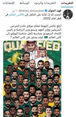 ونشر فهد المولد، لاعب المنتخب السعودي، صورة للاعبي المنتخب يتوسطهم وزير الرياضة الأمير عبد العزيز بن تركي الفيصل، معلقًا: «الحمد لله إذ أعاننا على التأهل إلى ⁧‫ # كأس_العالم‬⁩ في قطر لعام 2022. أرفع خالص التهنئة لمقام مولاي خادم الحرمين الشريفين وولي العهد وسمو وزير الرياضة ورئيس الاتحاد السعودي بمناسبة تأهل منتخبنا الوطني إلى كأس العالم 🇸🇦 كيف يمشي على كأس العالم؟».