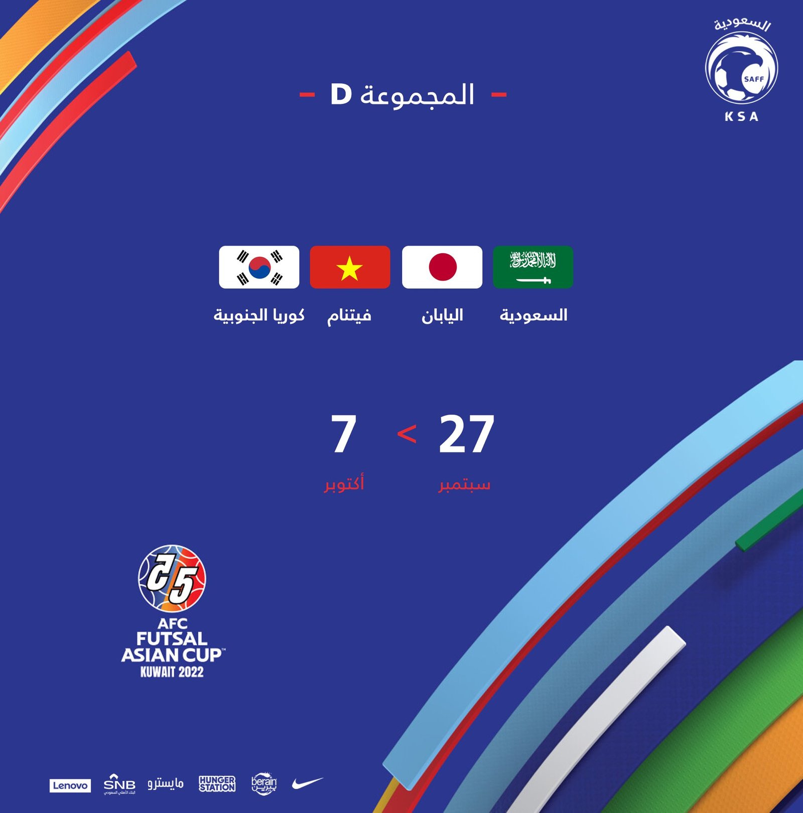 وأسفرت مراسم القرعة عن وجود المنتخب الوطني الأول لكرة قدم الصالات في المجموعة D بجانب منتخبات اليابان وفيتنام وكوريا الجنوبية، وتعتبر حظوظ منتخبنا في هذه المجموعة جيدة.