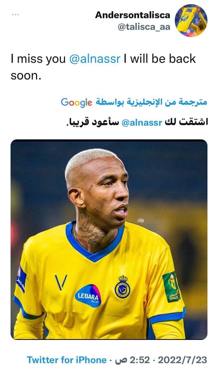 وهذا ما أكده تاليسكا عبر حسابة في تويتر حيث غرد قائلاً ( اشتقت للنصر وسأعود قريباً ) واضعاً حدّا لقلق جماهير النصر وإيضاحاً لعدم إنضمامه في المعسكر منذبدايته علماً بأن إدارة النصر ستطبق اللائحة الإنضباطية ضده في حال تأخره.