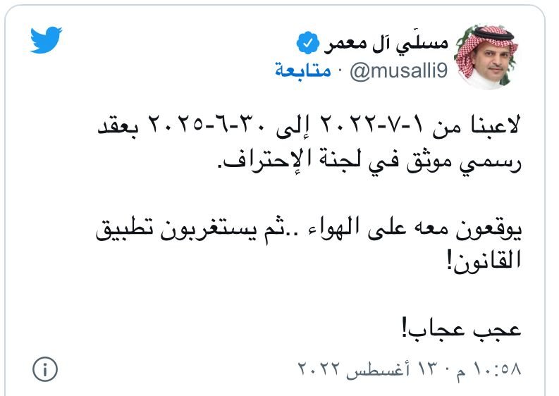 وكتب آل معمر عبر حسابه على موقع التواصل الاجتماعي “تويتر”:” لاعبنا من ١-٧-٢٠٢٢ إلى ٣٠-٦-٢٠٢٥ بعقد رسمي موثق في لجنة الإحتراف، يوقعون معه على الهواء ..ثم يستغربون تطبيق القانون، عجب عجاب”