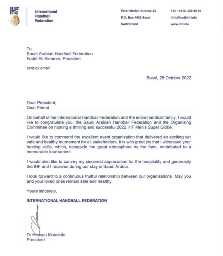 وجاء ذلك في رسالة بعثها رئيس الإتحاد الدولي لكرة اليد الدكتور حسن مصطفى لرئيس الإتحادين السعودي والعربي أ. فاضل النمر قال فيها: