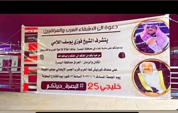 فمن خلال لافتة عُلقت على جسر الكورنيش، أعلن الشيخ فوزي يوسف اللامي عن دعوته “للأشقاء العرب والعراقيين لحضور مأدبة غداء، إجلالا للعرب والخليجيين” .